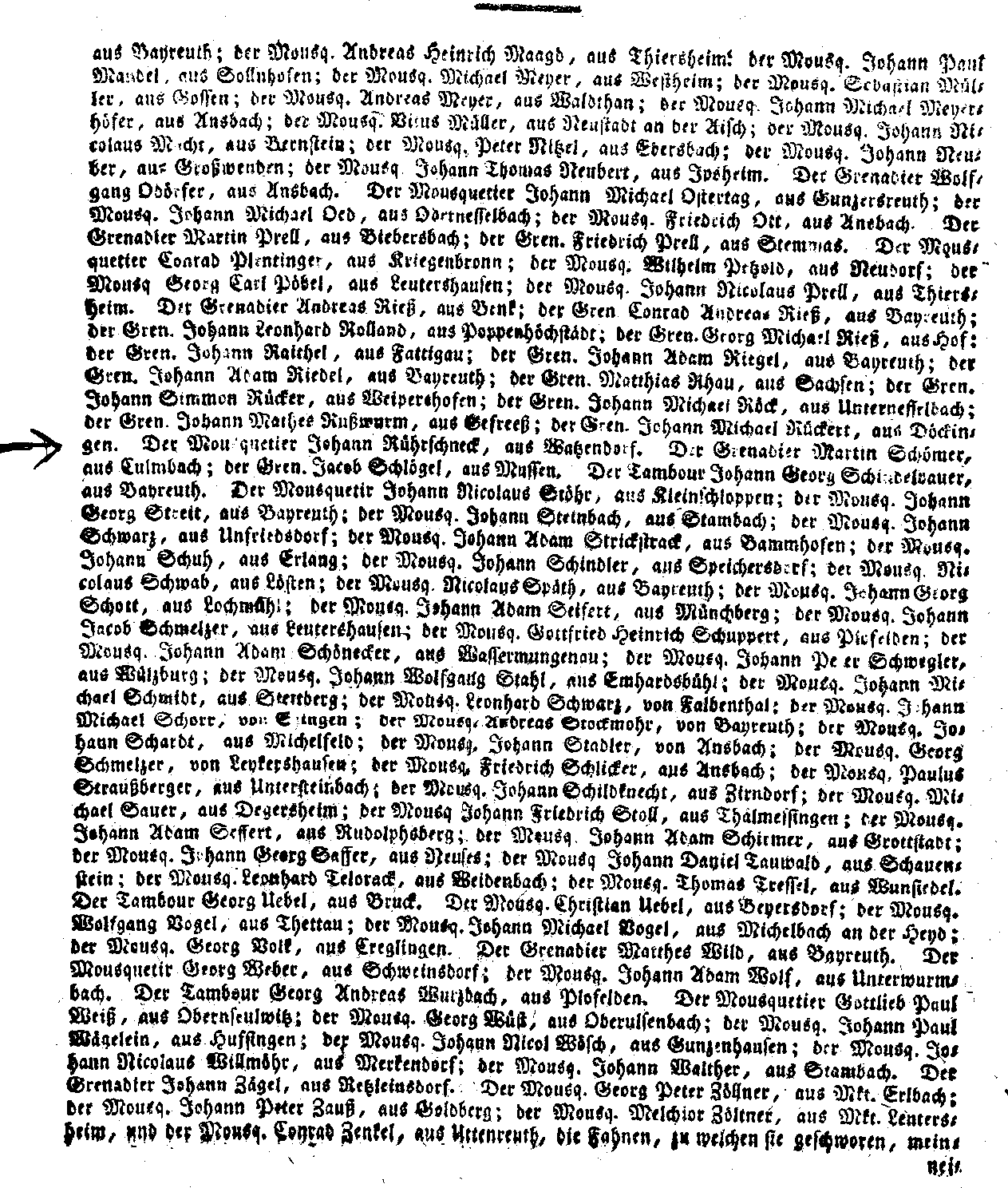 This so called "Wanted" list was uncovered by Ansbach-Bayreuth researcher Horst Lochner, who transcribed the 180 names and home towns of the deserted soldiers, and shared a copy of his transcription with me. I do not have a copy of the entire article, (maybe others do), but I do have a copy of the page that lists my ancestor, Johann Rierschneck as being from Watzendorf, which is indicated by an arrow. This Watzendorf notation is the only information ever found that would give any indication as to where to search for my ancestor, and indeed proved to be a vital clue in helping me find his place of birth in Germany. I do want to point out, however, that in my case, the town listed as Watzendorf was not the birthplace of my ancestor, but in actuality, turned out to be the district Waizendorf where he was living at the time that he was pressed into military service by the Ansbach troops.