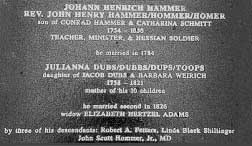 Johann Henrich HAMMER, a German born Hessian soldier from Hessen-Cassell, was sent by his sovereign to America as one of the British Auxiliary troops in von Knyphausen’s Regiment. His experiences during the Revolutionary War ranged from his landing in New York in 1776, his capture by George Washington’s troops at Trenton later that year, a year or so as a prisoner of war (worked out), a prisoner of war exchange, a sojourn to Canada, to his ultimate desertion from NY Island in November 1782 (after the fighting was virtually over). Henry returned to Jonestown, PA where he had been “hired out” while a prisoner of war. By trade, he was called a “weaver” on the company rolls, but in Jonestown, he worked as a parochial teacher. It was here that he married Julianna DUBS/DUPS/TOOPS, and they eventually had a family of 10 children. It was later here in this Pennsylvania “triangle” of Hessian soldiers that he began preaching in both the Reformed and Lutheran churches, apparently substituting for the “regular” ministers. Right after 1800, Johann Henrich HAMMER moved his family west to Huntingdon County, and eventually to Antis Township, which became a part of Blair County when it was formed from Huntingdon County. Rev. Henry lost his 1st wife, Julianna DUBS/DUPS/TOOPS in 1821, and re-married in 1826 to widow Elizabeth HERTZEL ADAMS. Since Henry left everything for the use of his widow at his death in 1830, his estate was not adjudicated until 1864, after her demise in 1861 (the latest death of a widow of a Hessian soldier in America, as far as can be found). Bio of Johann