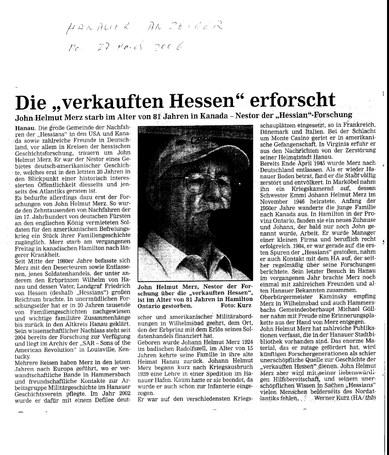 In the early 1990's, I saw a query in the Hamilton Branch of the O.G.S. Newsletter. A fellow member was looking for information on my ancestor, Heinrich Dickhaut. I called the phone number listed in the query and reached an answering machine. The man's voice on the recorded message had a noticeable German accent. I was puzzled, but left my number. John Merz returned my call. That telephone call resulted in a new friendship formed and my being the recipient of a great deal of information on my Hessian ancestor. With his wife Emmi and their children, John immigrated to Canada in April of 1957. The family settled in Hamilton. John worked hard and started a small business manufacturing wooden pallets for warehouses. After selling the business, he became a real estate agent. When John retired in 1984, he decided that he needed a hobby. He chose something he felt had been neglected in our schools, Canadian History. Eventually, his interest narrowed to Hessian soldiers of the American Revolution who settled in Canada. This became an all-consuming passion that would last the rest of his life. John was a tireless, meticulous researcher, a lecturer, and author. His contribution to Hessian research benefits genealogists and historians all over the world. John founded AMREV-HESSIANS, QUEBEC-HESSIANS, QUEBEC, AND UPPER CANADA mailing lists on the Internet, and had friends and contacts worldwide. In 2004, John turned over his research collection and his stock of published books to the 7th Town Historical Society, located at the Marilyn Adams Genealogical Research Centre in Ameliasburg, ON www.quinte-kin.com John was a good husband, father, grandfather, and friend to many. He passed away on March 24, 2006, in his eighty-second year. Thank you for your legacy, John. You will be missed.