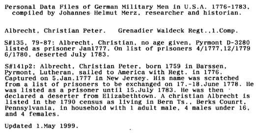 Personal Data Files of German Military Men in USA 1776-1783. Compiled by Johannes Helmut Merz, Researcher and Historian.