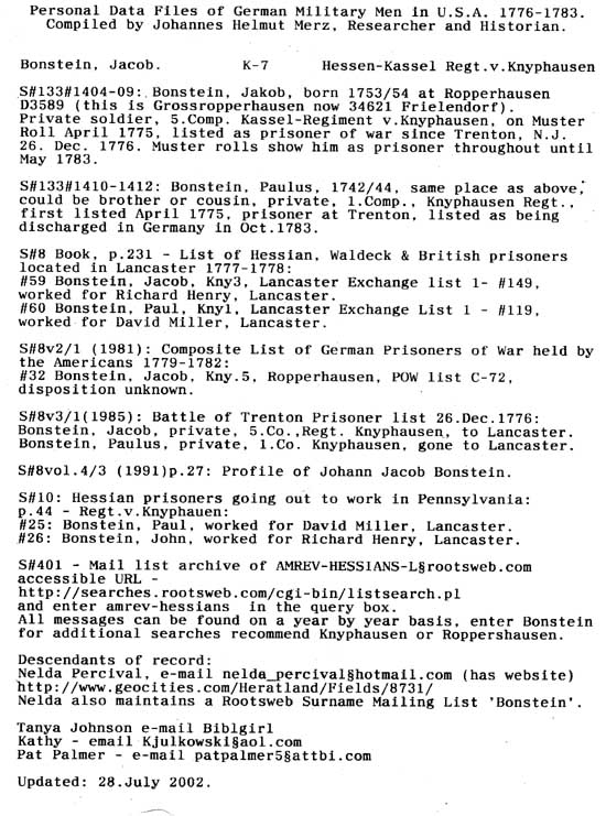I have to put a note here. This is my ancestor, My website has changed to http://freepages.genealogy.rootsweb.com/~bonsteinandgilpin/ Use the link at family trees to find the Bonstein tree or for Bonstein history use the button link at the home page. You will also find a link to Tanya Johnson's webpage. Nelda L. Percival, Hessian Descendant