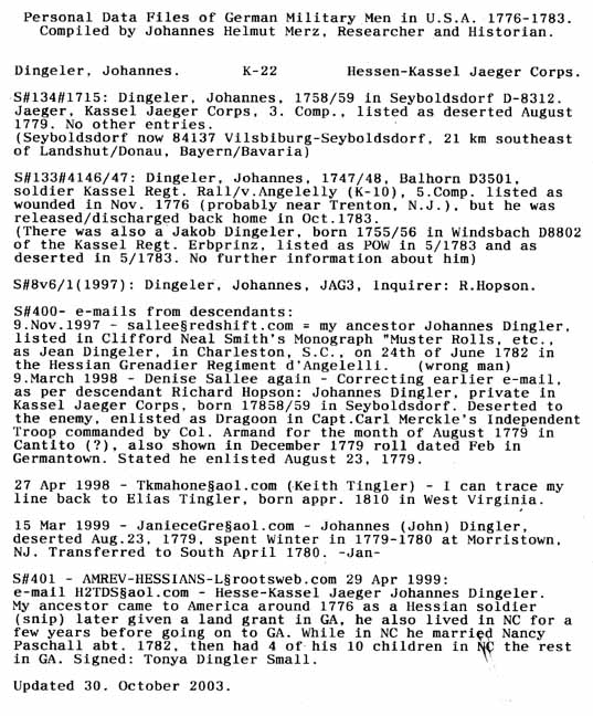 Personal Data Files of German Military Men in USA 1776-1783. Compiled by Johannes Helmut Merz, Researcher and Historian.