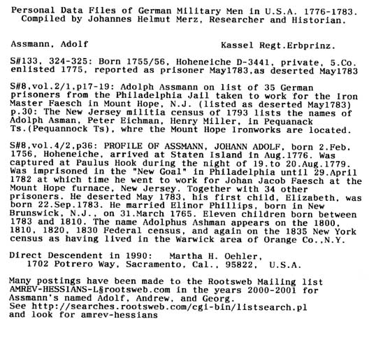Personal Data Files of German Military Men in USA 1776-1783. Compiled by Johannes Helmut Merz, Researcher and Historian.