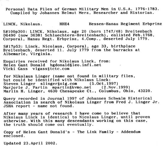 Personal Data Files of German Military Men in USA 1776-1783. Compiled by Johannes Helmut Merz, Researcher and Historian.