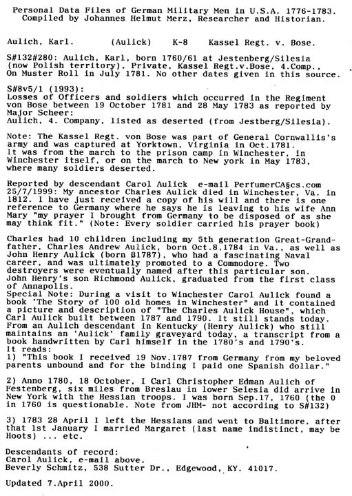 Personal Data Files of German Military Men in USA 1776-1783. Compiled by Johannes Helmut Merz, Researcher and Historian.