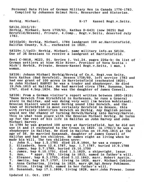 Personal Data Files of German Military Men in Canada 1776-1783. Compiled by Johannes Helmut Merz, Researcher and Historian.