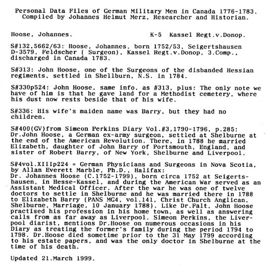 Personal Data Files of German Military Men in Canada 1776-1783. Compiled by Johannes Helmut Merz, Researcher and Historian.