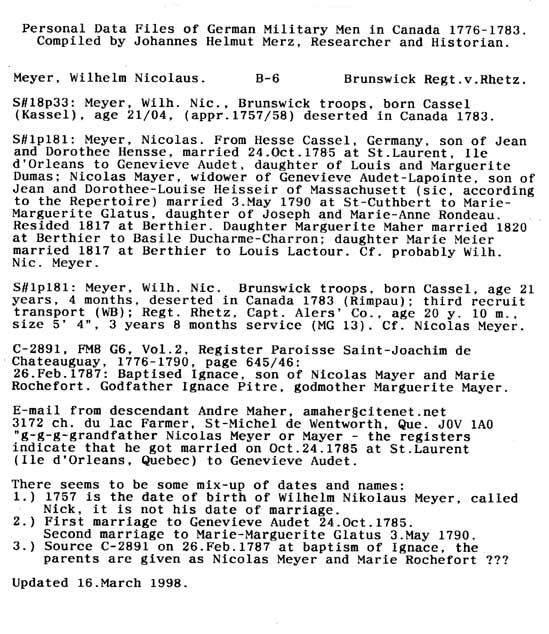 Personal Data Files of German Military Men in Canada 1776-1783. Compiled by Johannes Helmut Merz, Researcher and Historian.