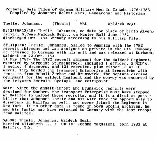 Personal Data Files of German Military Men in Canada 1776-1783. Compiled by Johannes Helmut Merz, Researcher and Historian.