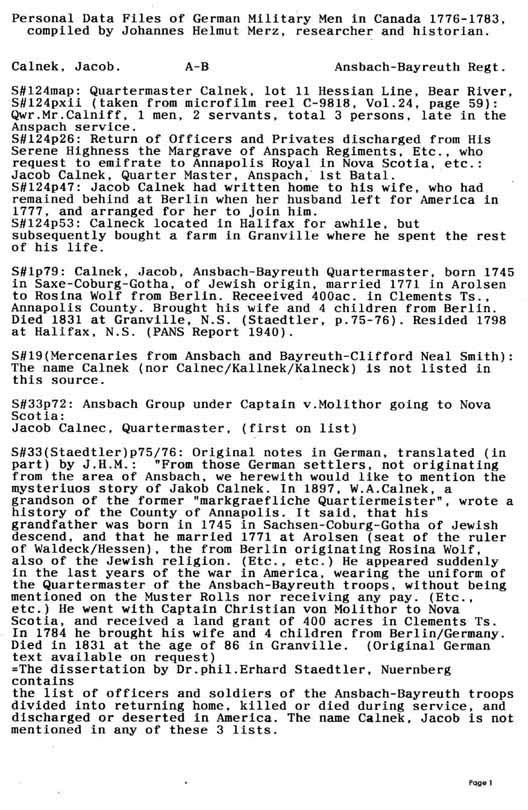 Personal Data Files of German Military Men in Canada 1776-1783. Compiled by Johannes Helmut Merz, Researcher and Historian.