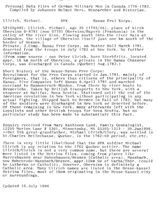 Personal Data Files of German Military Men in Canada 1776-1783. Compiled by Johannes Helmut Merz, Researcher and Historian.