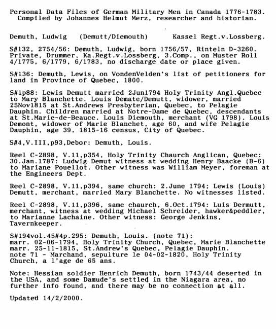 Personal Data Files of German Military Men in Canada 1776-1783. Compiled by Johannes Helmut Merz, Researcher and Historian.