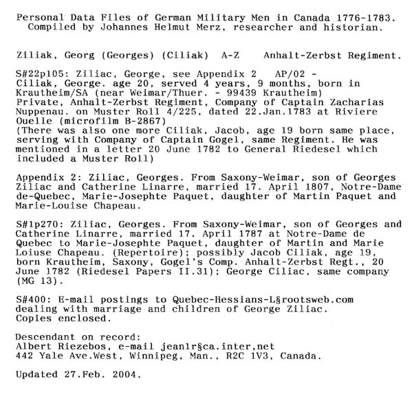Personal Data Files of German Military Men in Canada 1776-1783. Compiled by Johannes Helmut Merz, Researcher and Historian.